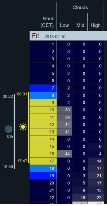 Opkomst maan/zon en bewolking