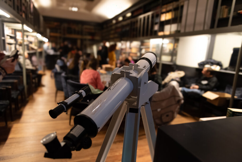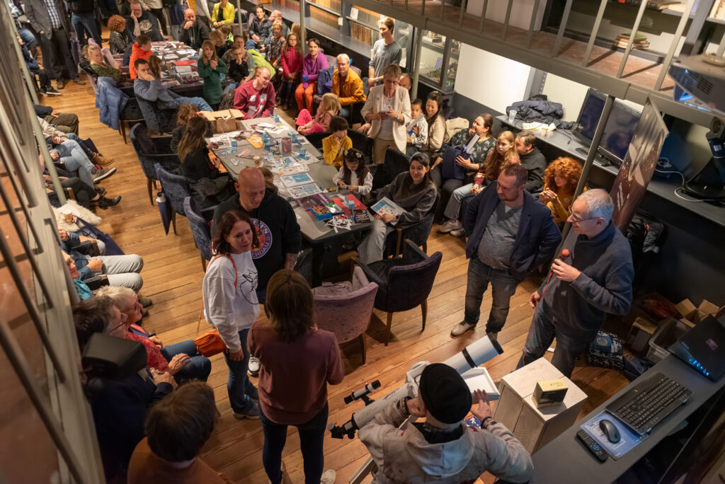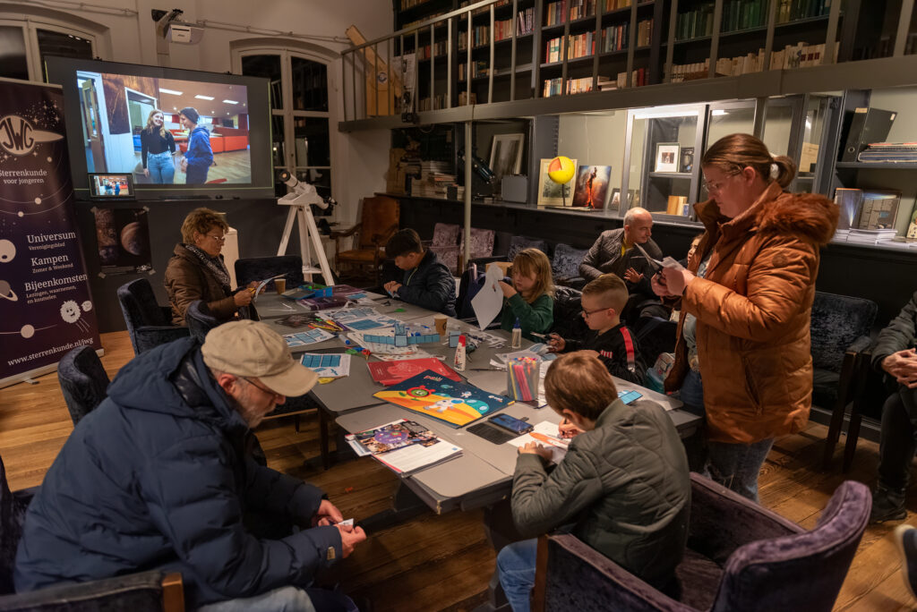 Vervolgens konden ze de trappen volgen naar onder andere de bibliotheek, zolder en de koepel. Bij binnenkomst bij de bibliotheek konden de eerste lootjes gecontroleerd worden of er een prijs gewonnen was. Eenmaal in de bibliotheek was er plek voor een kopje koffie of thee en konden de kinderen knutselen met de Jongeren Werkgroep Sterrenkunde. Ook was Corné aanwezig voor alle vragen over astrofotografie.